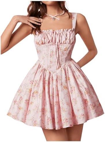 SHENHE Women’s Floral Corset Mini Dress Square Neck Smocked Fit and Flare Flowy Boho Dress