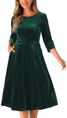 Allegra K Velvet Dresses for Women’s Elegant Crew Neck 3/4 Sleeve Valentine’s Day Club Pleated A Line Midi Dress