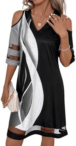 Women’s Cut ‍Out Mesh Cold Shoulder ⁣Short Dress V Neck ⁢Color Block Tee Dress Casual Summer Dresses