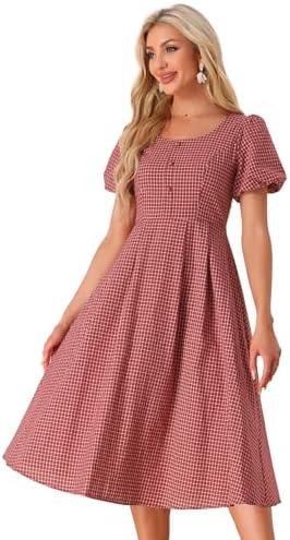 Allegra​ K Plaid Maxi Dress for Women’s Summer Pleated Back Button Decor ⁤Puff ​Sleeve Dresses