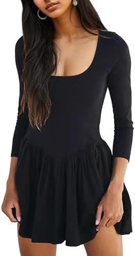 This stylish mini dress showcases a square neckline and long sleeves, making it a versatile addition to your wardrobe. The drop-waist design and pleated ruffle hem add an elegant touch, perfect for various occasions such as daily wear, shopping trips, or special outings. Available in sizes small to large, it is crafted to flatter different body types with its slim fit. It’s a blend of sophistication and comfort, ensuring you feel good while looking great.