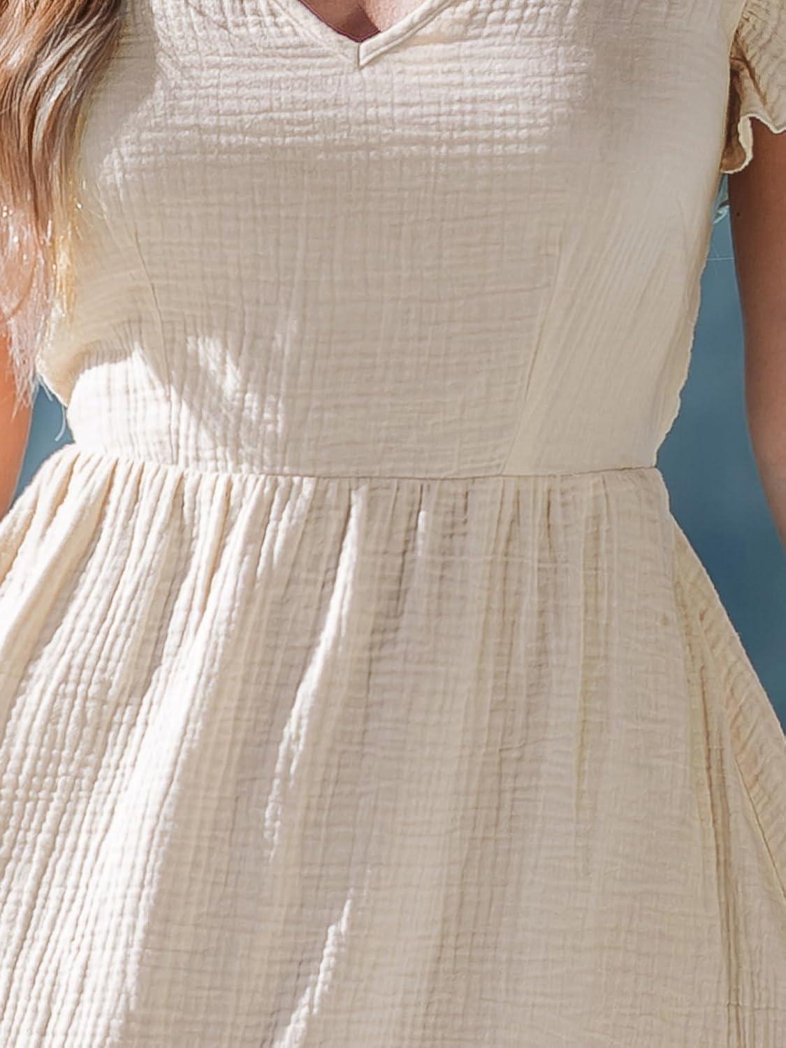 The design effortlessly captures casual elegance with its flutter sleeves that add a delicate, airy touch, perfect for warm summer days. The V-neckline beautifully frames the collarbone, giving the silhouette a flattering and elongating effect without being too bold. One of the standout design elements is the self-tie back, which allows for a personalized fit and doubles as a charming bow that highlights the waist with a feminine flair. The mini length combined with an A-line cut creates a playful yet comfortable shape that moves freely while maintaining structure.