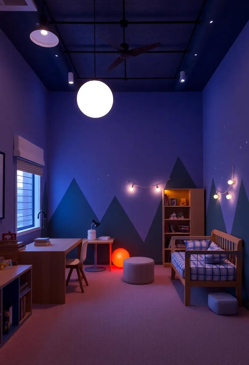 Another captivating option is to install thematic table lamps that add an interactive element to the room. Such as, a rocket ship lamp can provide focused light during storytime, while a dinosaur nightlight can provide comfort at bedtime.provide additional ambiance with glow-in-the-dark stickers that enhance the theme—imagine the joy of discovering glowing planets in a space-themed room or constellations in a night sky. Create a layered lighting system that encourages play by providing bright lighting for activities and softer tones for relaxation, perfectly aligning with the adventurous spirit of childhood.