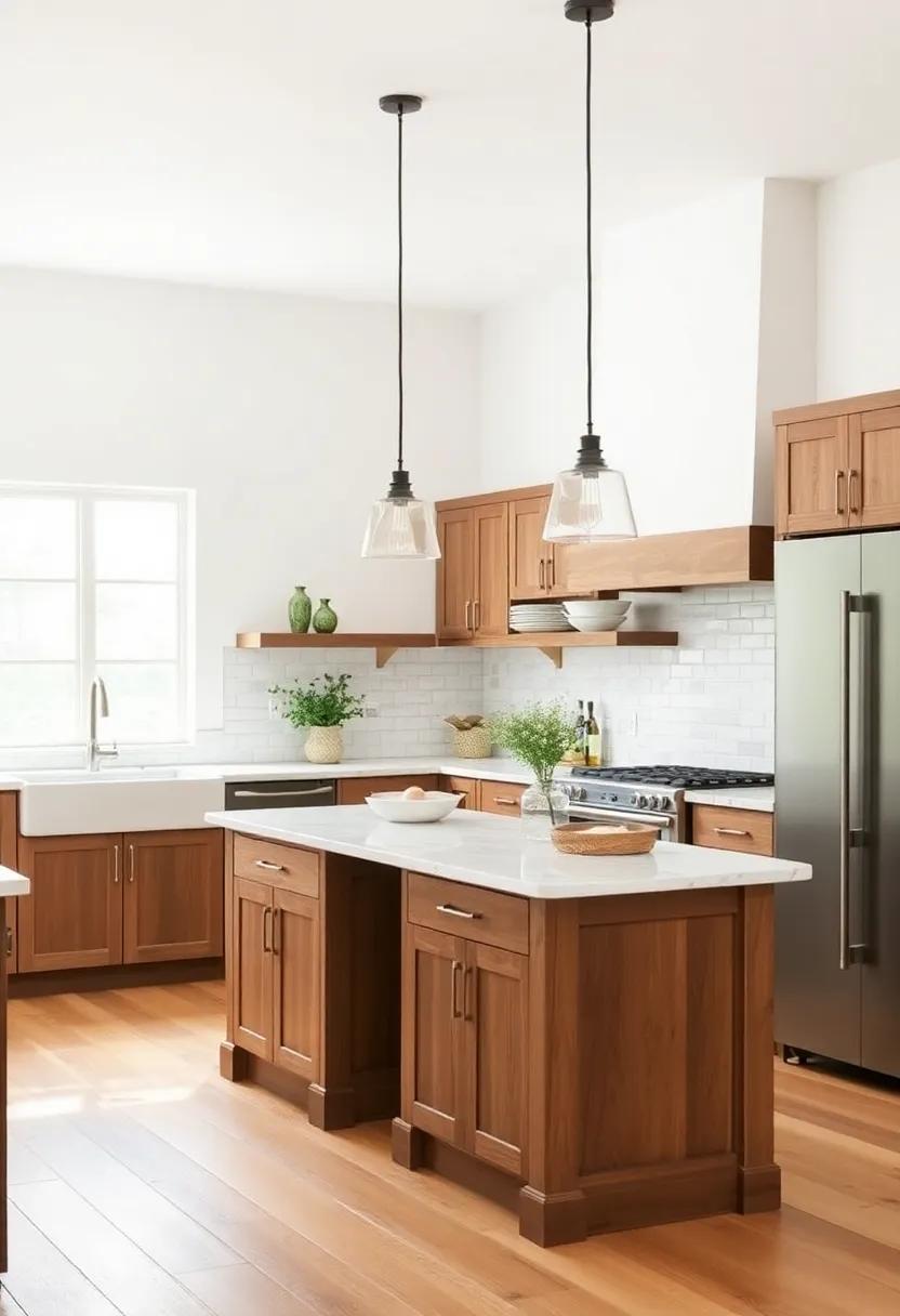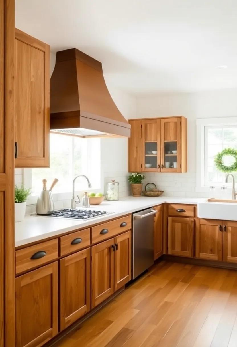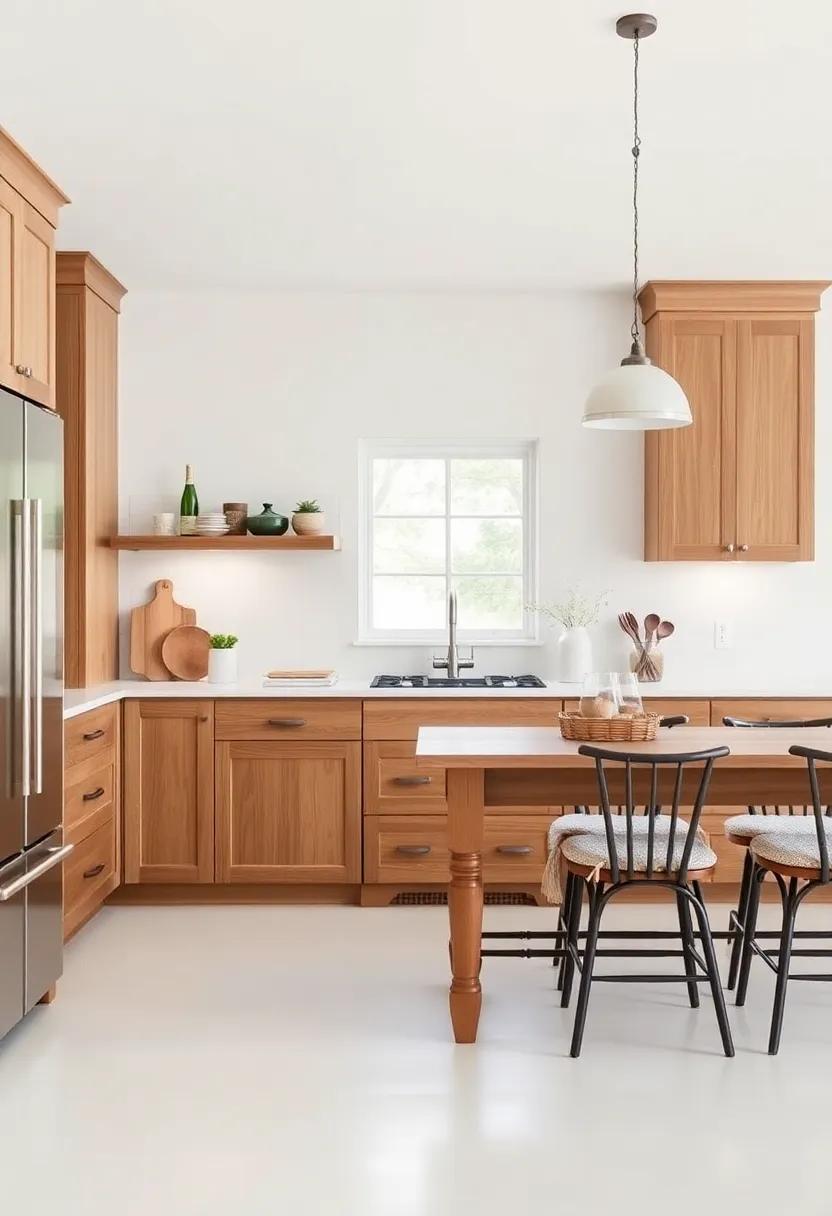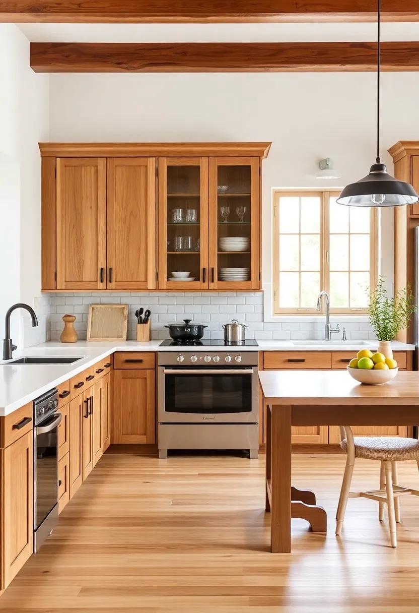 Combining the charm of a traditional farmhouse with contemporary conveniences can create a harmonious balance in kitchen design.Imagine sleek stainless steel appliances that blend seamlessly with warm oak cabinets, offering both functionality and visual warmth. To enhance this aesthetic, consider simple yet effective design choices, like: