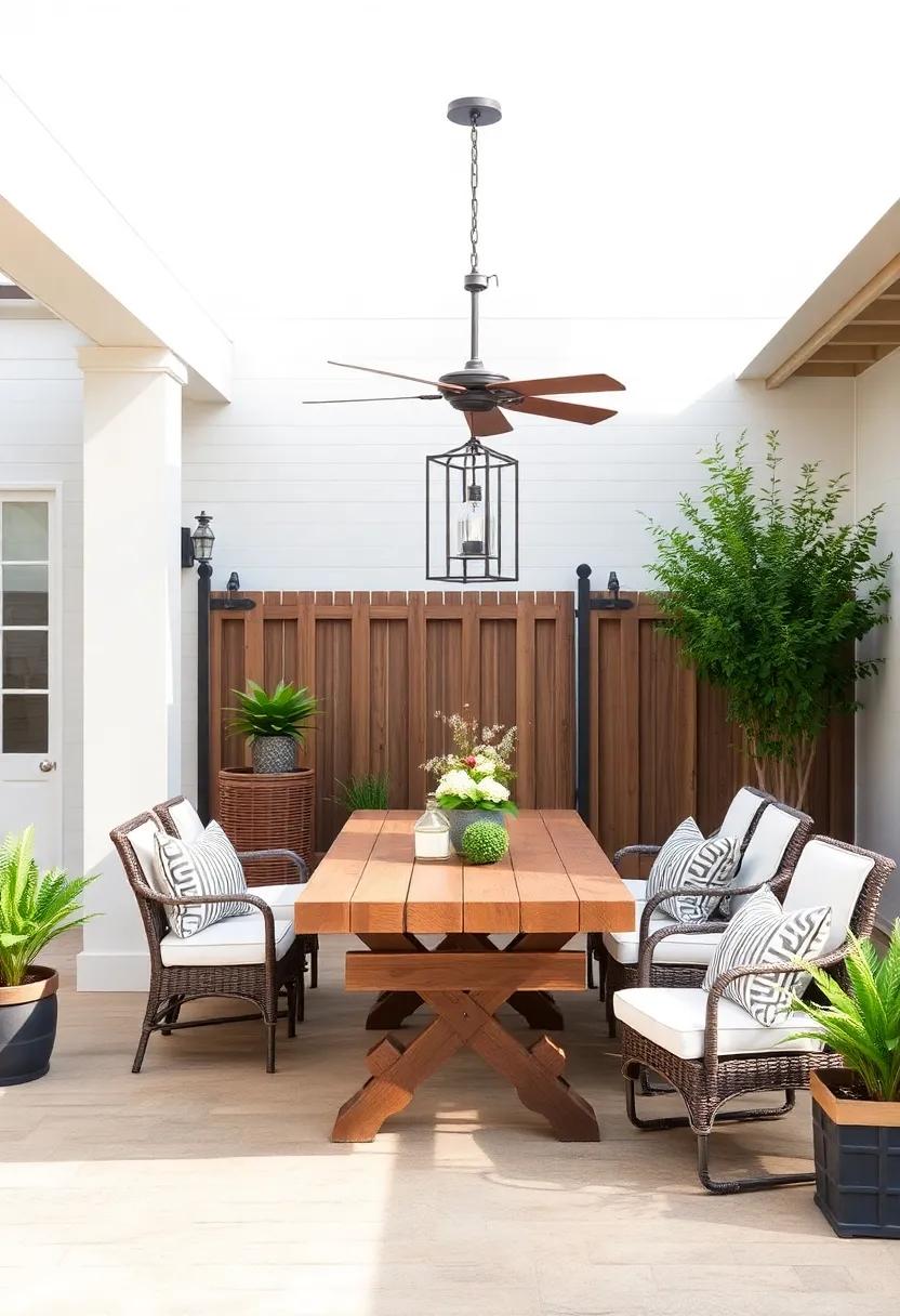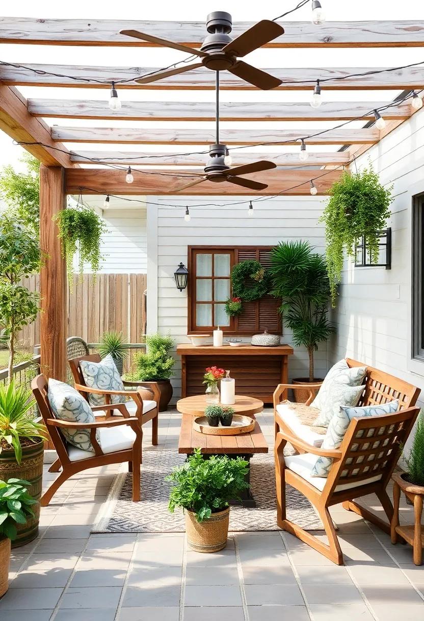 Transform your patio into a cozy haven with plush textiles and inviting blankets that beckon you to relax and enjoy the outdoors. Choose soft, textured fabrics such as oversized knit throws, faux fur, and light cottons that are perfect for draping over your outdoor furniture. These materials not only offer warmth but also add depth and character to your rustic farmhouse aesthetic. Consider incorporating a variety of colors and patterns—think earthy tones, subtle plaids, and floral prints—that harmonize with your greenery and wooden accents.