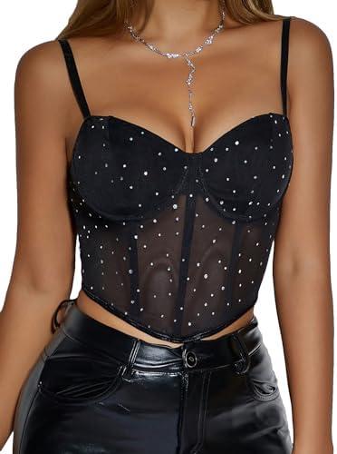 Verdusa Women’s Rhinestone Mesh Bustier Spaghetti Strap Sleeveless Crop Cami Top