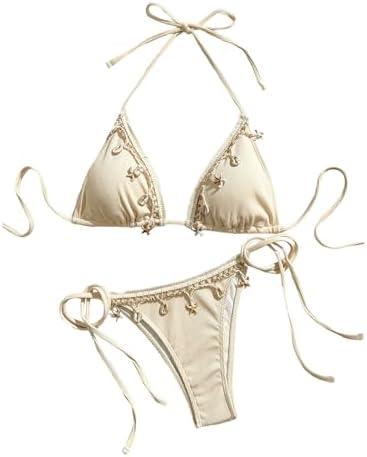 Verdusa Women’s 2 Piece Halter Triangle Bathing Suit Ribbed Bikini Swimsuits Beige Small