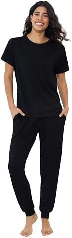 This sleepwear set is designed for comfort, utilizing 95% bamboo viscose, which is known for its softness and breathable qualities. Women who find it challenging to maintain a comfortable temperature while sleeping will appreciate the moisture-wicking feature that helps regulate body heat. The jogger pants and short sleeve top are not only stylish but also allow for ease of movement, making them perfect for lounging or sleeping. The luxurious feel of the fabric drapes beautifully without being clingy, ensuring maximum comfort throughout the night or during a cozy day in.