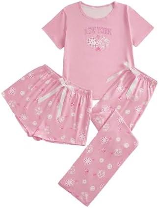 Verdusa Women’s 3 Piece Cartoon Print Pajama Sets Tee Top And Shorts Pants Pj Set Pink Medium