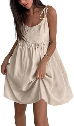 UANEO Summer Dresses for Women 2024 Cotton Linen Mini Sleeveless Tie Strap Dress Sundress