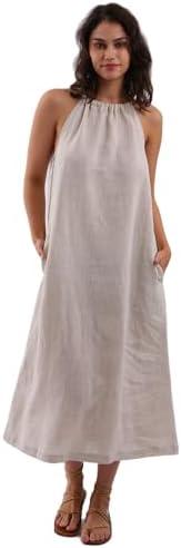 Designed for comfort and versatility, this halter neck maxi dress is a perfect addition to any wardrobe. Its adjustable halter strap allows you to personalize the neckline according to your style preferences, creating a flattering silhouette. The inclusion of two side pockets adds practicality, making it easy to carry essentials without needing an extra bag. Made of 100% linen, the fabric is breathable and ideal for warm weather, although its natural texture may not be as soft as cotton. It features a self-tie back and a removable belt, providing options for a tailored fit that enhances your figure.