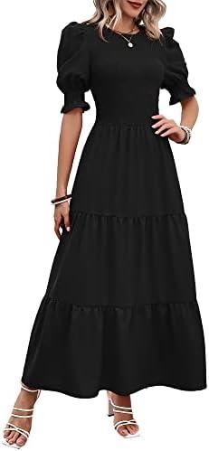 The latest floral print maxi dress features a soft, flowing material that is lightweight and comfortable, making it perfect for warm weather outings or beach vacations. Its unique printed design allows for versatility, as it can be easily styled up or down for any occasion. The ruffle hem and smocked bodice provide an elegant flare, while the cute puff short sleeves and crew neck add charming details to the overall aesthetic. This tiered dress transitions seamlessly from spring to summer, offering a fashionable yet relaxed look.
