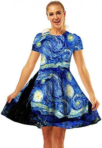 Women’s 3D Print Short Sleeve Casual Flared A-line Swing Midi Dress