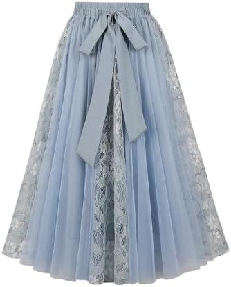 Womens Lace Maxi Tulle Skirts Elastic Waist A line Wedding Flowy Blue Boho Pleated Skirt for Woman