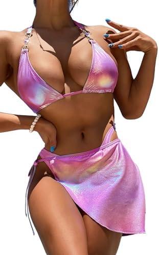 Women’s⁤ Sexy Liquid Metallic ⁢Triangle Diamond Bikini ‌Bathing Suit with Glitter Skirt ‍3 Piece Swimsuits