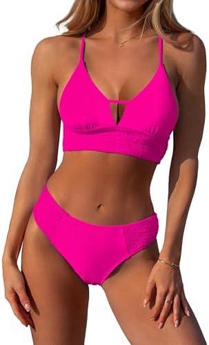 Beachsissi Womens Bikini Set Smocked Deep V Neck Bathing Suit Crisscross Back Self Tie Swimsuits