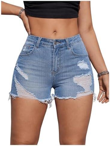 Women’s Solid Ripped Raw Hem High Waist Jean Distressed Short Zipper Denim Shorts with Pocket
