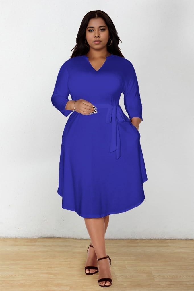 This dress shines in its versatility, making it a staple piece for a variety of settings. The elegant A-line silhouette paired with the flattering V-neck and 3/4 sleeves ensures a comfortable yet polished look. For styling, we suggest accentuating the waist with the included belt to define your figure, while the pockets add a practical touch that complements casual and semi-formal appearances alike. Pair it with strappy sandals or classic pumps to transition effortlessly from daytime errands to evening cocktails.