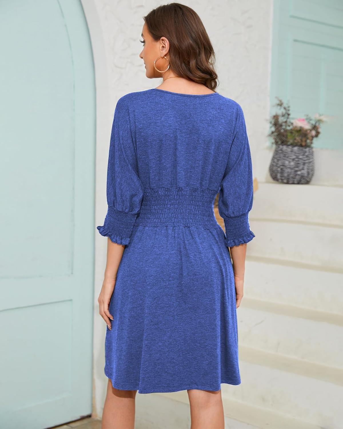 The A-line silhouette of this dress truly stands out by flattering a variety of body shapes with its classic, flowing cut. it gently skims the waist and hips, creating a balanced and feminine shape without feeling restrictive. The elastic ruched waist adds definition, accentuating curves in a subtle yet elegant way that makes us feel both comfortable and confident. Paired with the crew neck and 3/4 sleeves, the overall design feels effortlessly chic, perfect for everything from casual outings to more dressed-up occasions.