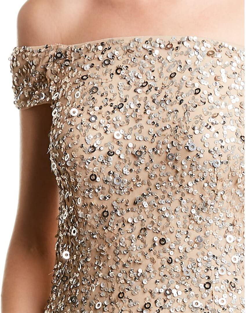 examining the beadwork closely, the craftsmanship truly stands out with its intricate crunchy beading that creates a stunning tactile texture. Each bead is meticulously placed, enhancing the mermaid silhouette with a dimensional shimmer that plays beautifully under light. The off-shoulder design allows these embellishments to frame the neckline exquisitely, offering a delicate balance between bold sparkle and elegant sophistication.