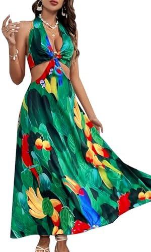 This captivating dress features a sexy V-neckline with a halter design and a chic tie at the back, making it perfect for warm summer days. The eye-catching cut-out at the waist adds a distinctive touch, enhancing your silhouette while maintaining comfort. Crafted from a blend of 95% polyester and 5% spandex, it ensures a flattering fit without compromising on movement, making it an ideal choice for beach outings or summer parties. The dress showcases a vibrant tropical pattern that resonates with vacation vibes, making it a choice accessory for your holiday wardrobe.