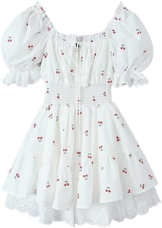 This stunning mini dress is crafted from high-quality 100% polyester, ensuring a comfortable and stylish wear. The enchanting lace spliced design introduces an elegant touch, while the charming cherry print adds a playful element that is ideal for warmer weather. Featuring vintage puff sleeves, the dress creates a romantic look, perfectly complemented by its mini length that highlights your legs. An elastic waist provides a flattering fit, making it suitable for various body types, perfect for a holiday party or casual outing.