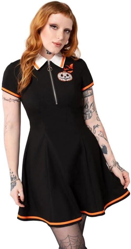 Step into the spooky season with this enchanting mini dress that beautifully combines gothic charm and festive flair. Made with a soft and slightly stretchy fabric blend, it features a bold white pointed collar and striking jack-o-lantern embroidery prominently displayed on the chest. The exposed chunky silver zip with a ring puller not only adds an edgy vibe but also enhances the dress’s unique character. Short sleeves trimmed with vibrant orange detail lend a playful touch, while princess seams create a flattering silhouette.