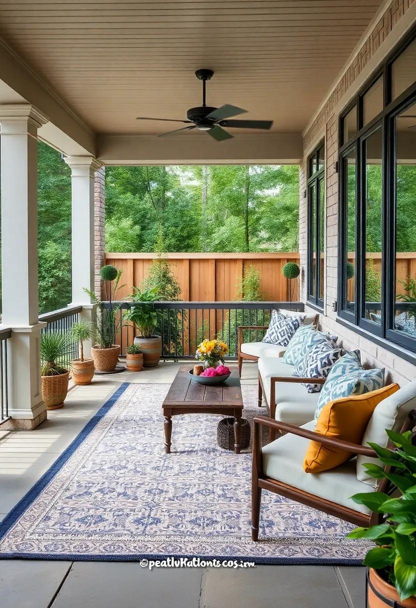 Incorporating outdoor rugs can also enhance the functionality of your porch by defining different zones. As an example, you might use a rich, dark-hued rug in a reading nook to create a cozy atmosphere while keeping lighter, more playful rugs under dining arrangements. Consider these options for layering colors and textures: