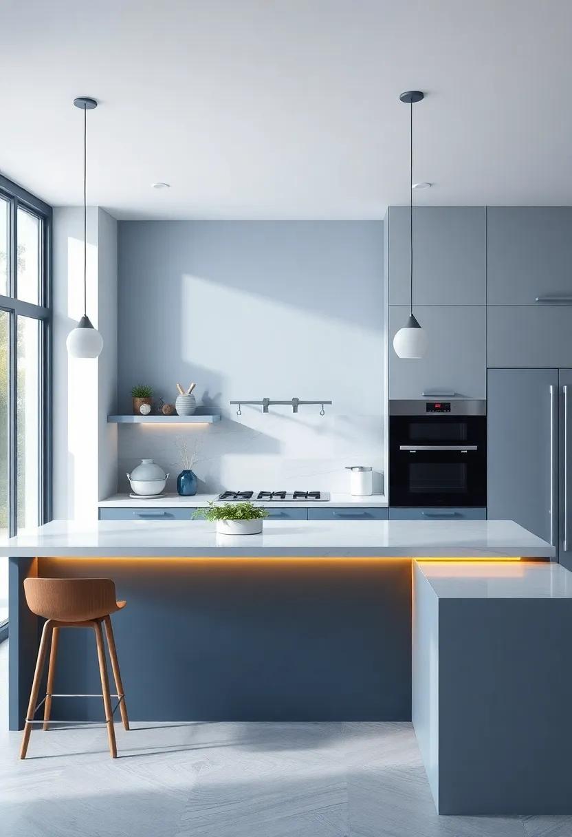 Designing a kitchen enveloped in the soothing tones of blue and gray not only enhances visual appeal but also fosters an atmosphere conducive to culinary creativity. To achieve this, consider incorporating open shelving to display beautiful dishware or captivating cookbooks, promoting both accessibility and inspiration. Additionally, integrating a central island can serve as the heart of your kitchen, encouraging collaboration and inviting social interaction during meal readiness. Emphasizing natural light through strategically placed windows or skylights can further elevate the mood, making the space feel warm and inviting.