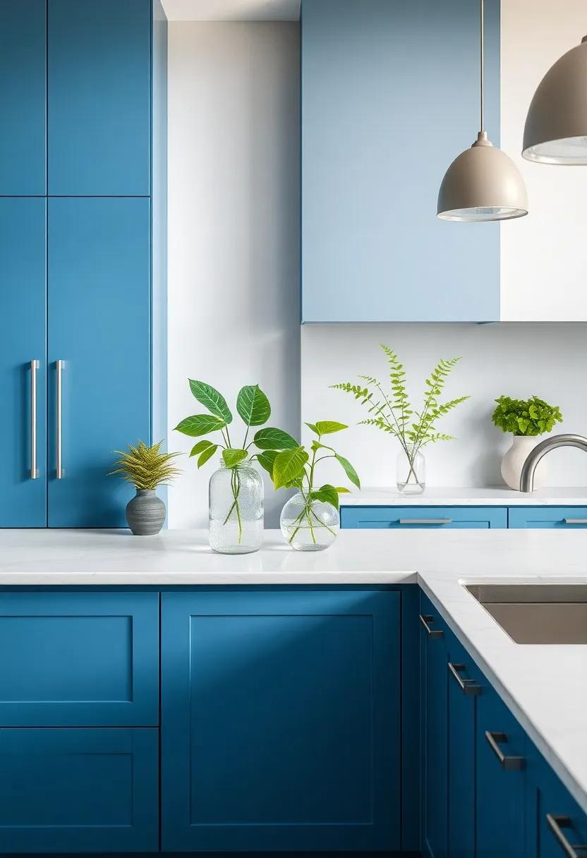 By carefully selecting the right plants and their placements, you can seamlessly integrate nature into your kitchen, fostering a refreshing environment that enhances the luxurious feel of blue and gray design elements.