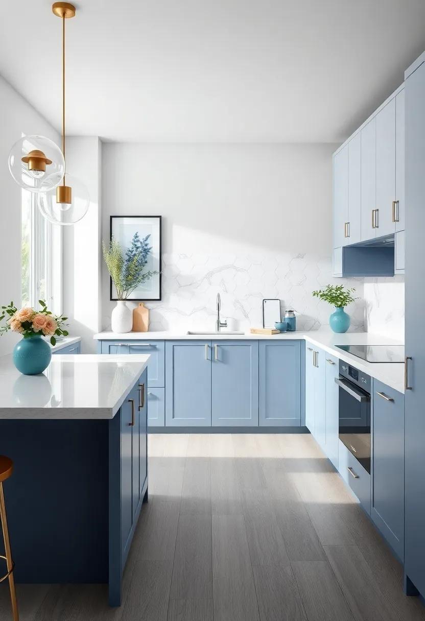 To create a polished and sophisticated kitchen space, incorporating final touches is essential. Consider layering textures through the use of elegant fabrics, such as plush cushions and stunning table linens, which can complement the sleek lines of your blue and gray cabinetry. Incorporate artistic elements like chic artwork or unique sculptures that resonate with the color scheme, creating a visual coherence that welcomes guests and inspires creativity. Additionally, integrating metallic accents, such as brass or chrome fixtures, can elevate the overall aesthetic, providing a hint of glam that balances beautifully with the serene palette.