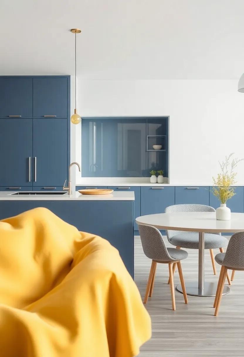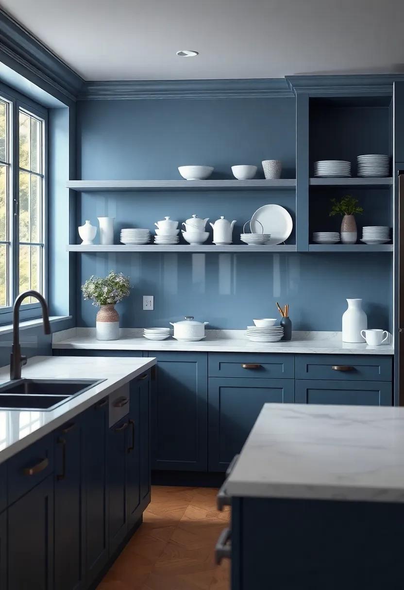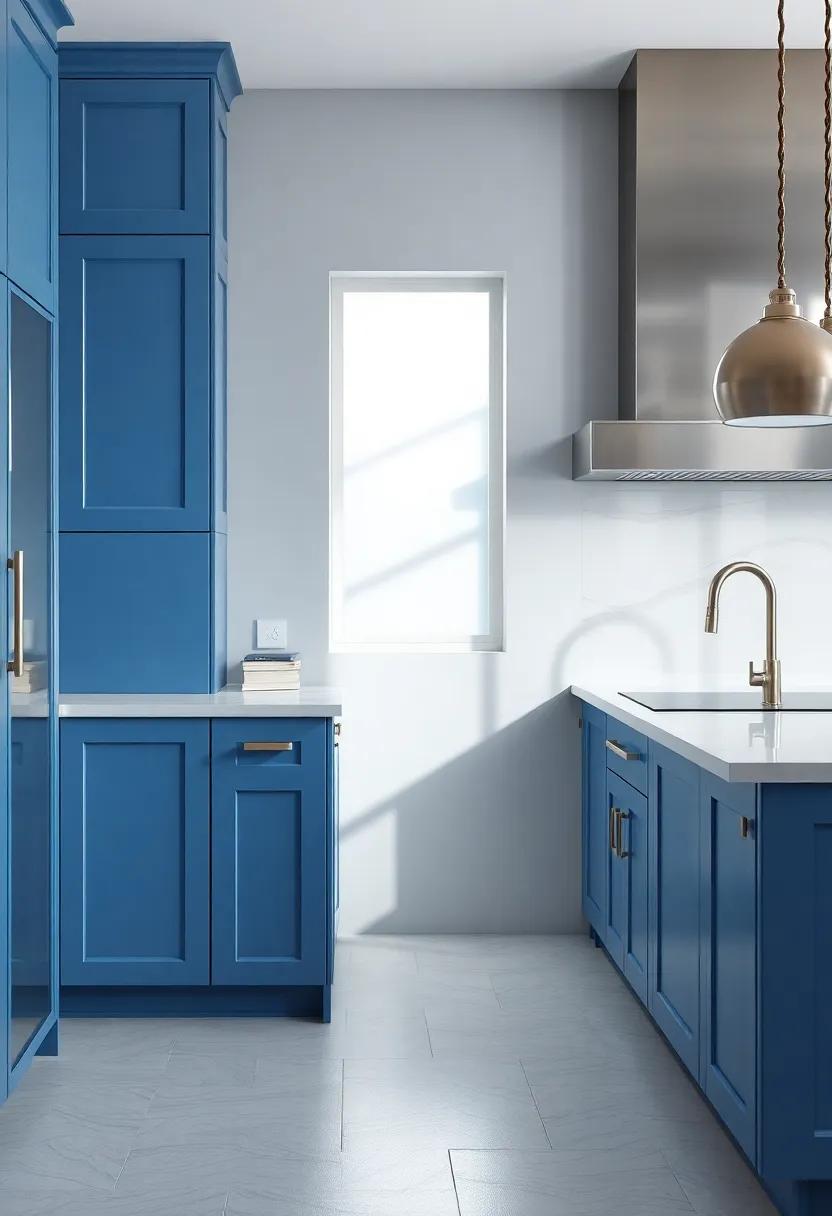 Imagine stepping into a kitchen where every hue whispers of tranquility and elegance. Combining soft, serene blues with refined shades of gray creates an atmosphere that feels both calming and sophisticated. Picture deep azure cabinets paired with sleek gray countertops, reminiscent of the soothing waves meeting tranquil shores. Natural light streaming in through large windows will bounce off these colors, enhancing the serene vibe while making the space feel open and airy.