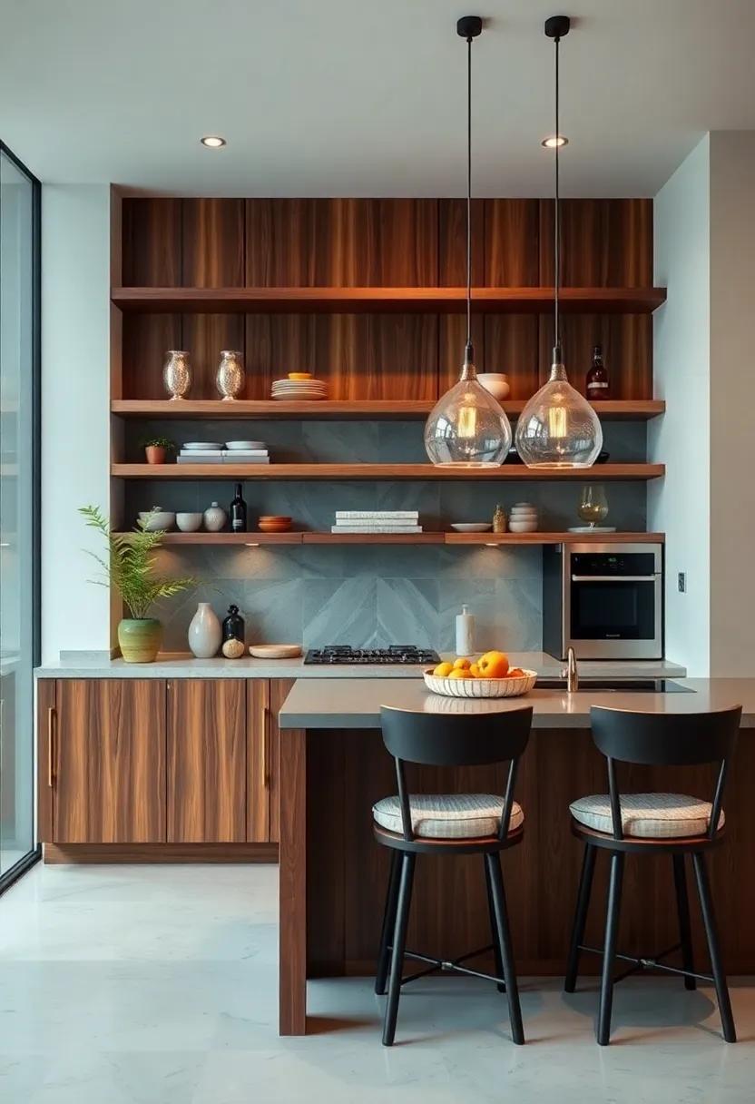 - Layered Heights: Use open shelving at various heights to create dimension, complemented by glass cabinets that draw the eye upward.