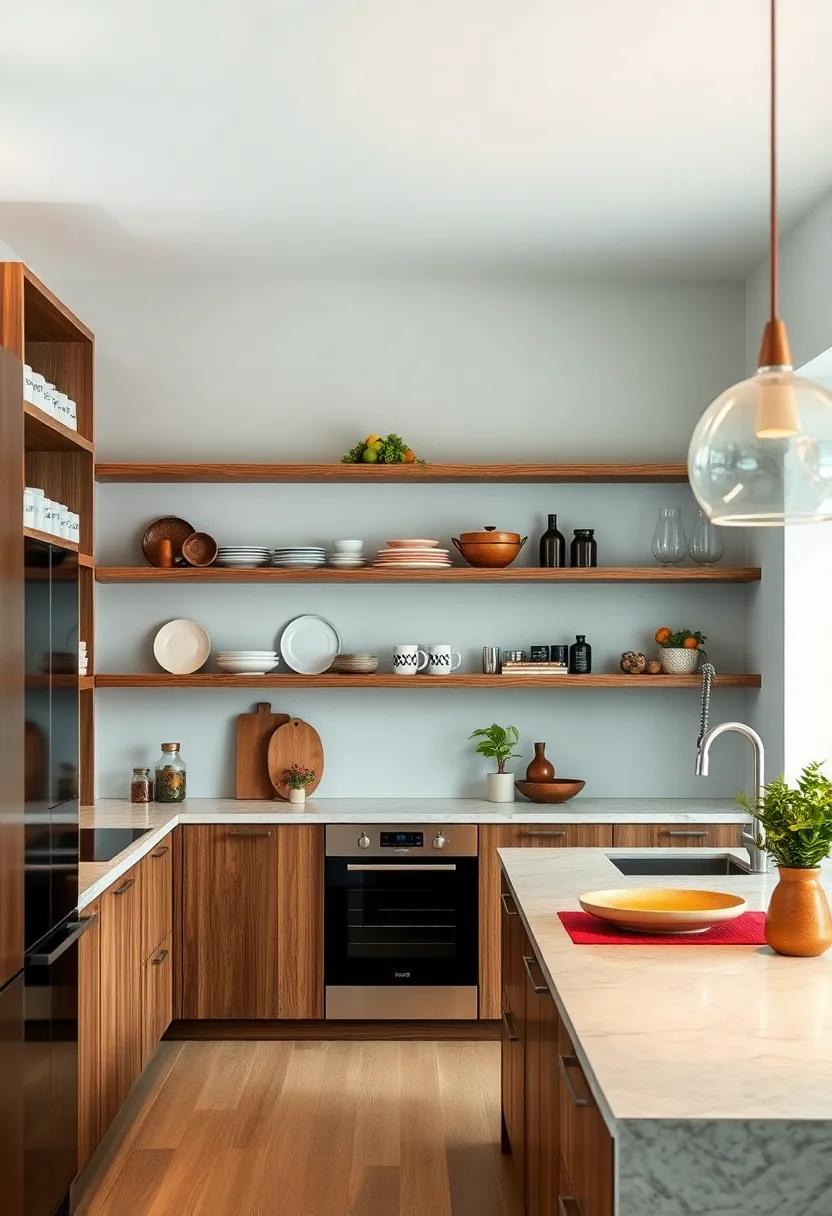 When selecting materials for your open shelves, opt for combinations that complement your existing décor. Natural wood adds warmth, while metal accents introduce a hint of industrial flair. Don’t hesitate to incorporate textured elements such as wicker baskets or ceramic jars to break the monotony. For practical organization, utilize decorative dividers or brackets that harmonize with the overall theme. A subtle color palette can unify the space, while occasional pops of color through kitchenware or decorative items will draw the eye. Explore these ideas to craft a layered shelving arrangement that embodies both functionality and elegance.