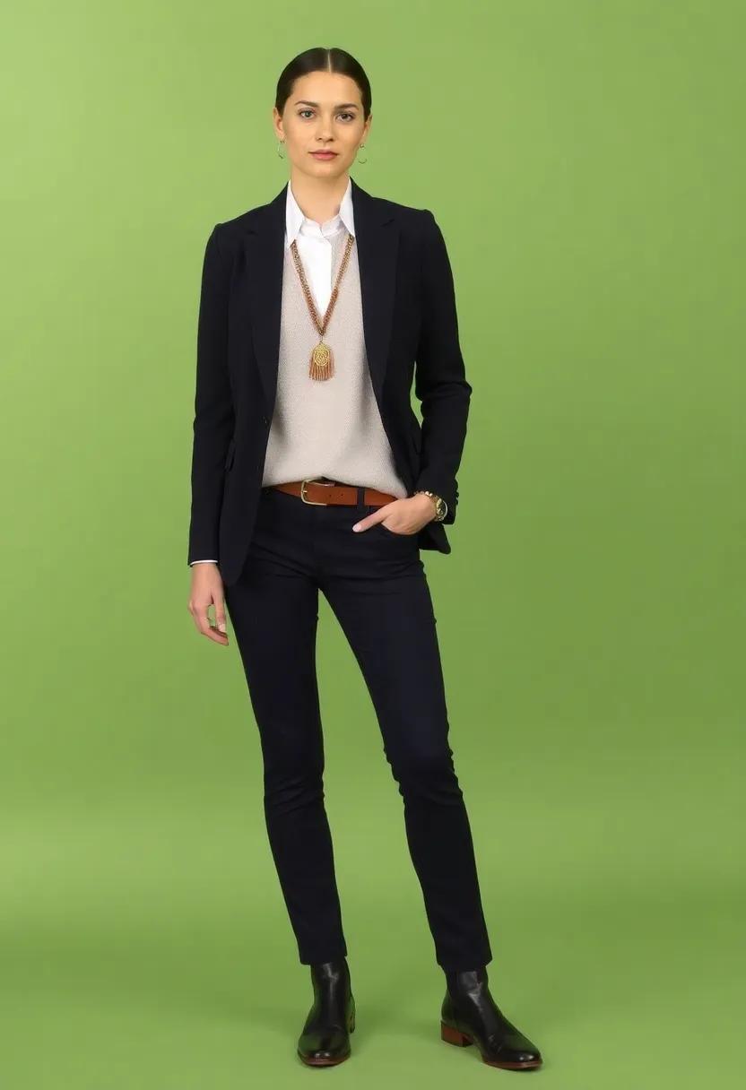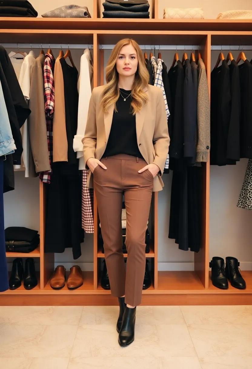 - Office Ready: Tailored blazer, fitted trousers, and loafers.
