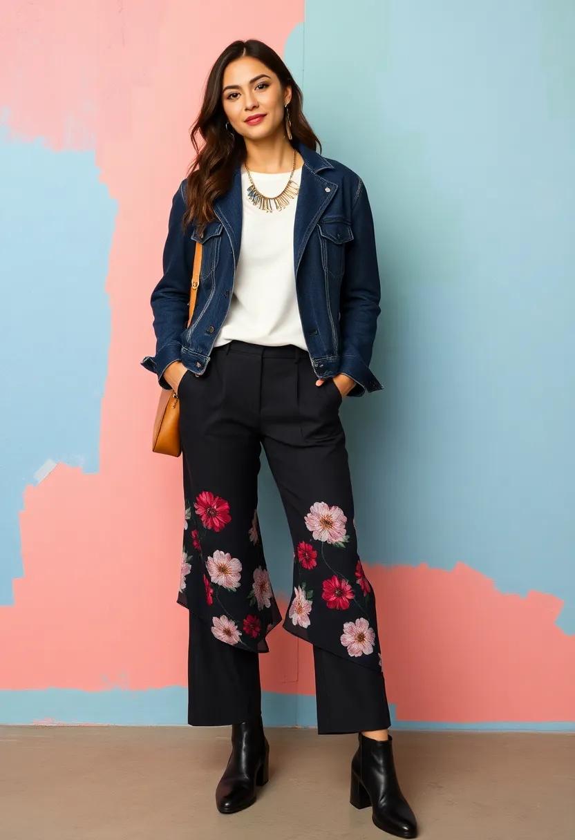 - Casual Chic: Denim jacket, white tee, and a floral midi skirt.