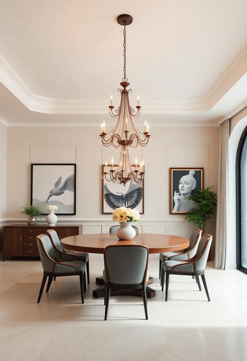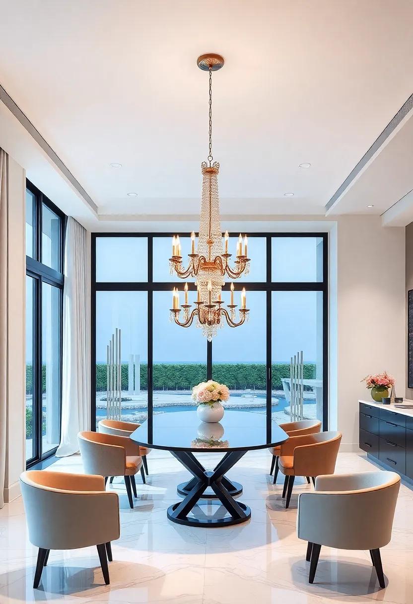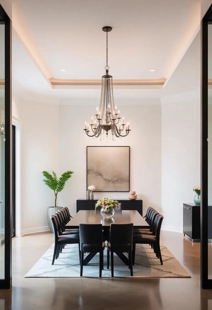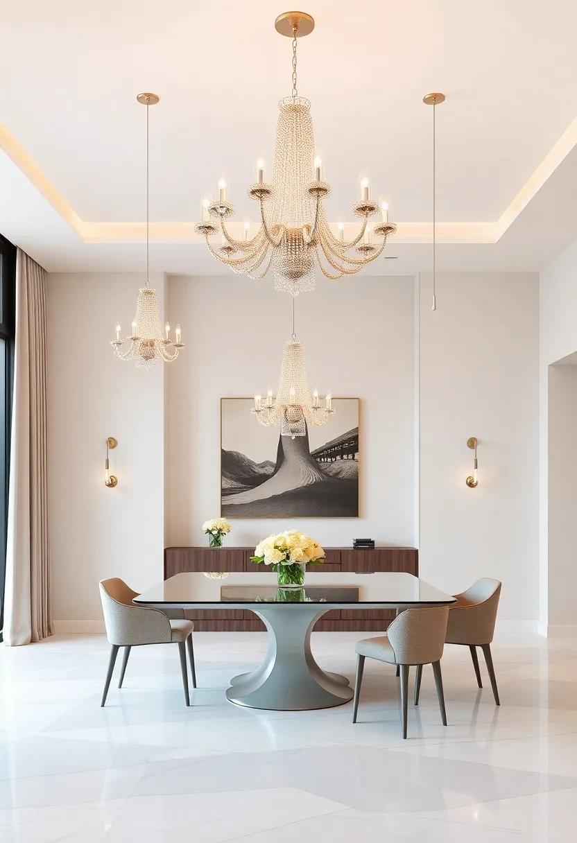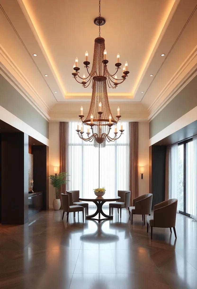 Utilizing layered lighting in combination with your chandelier can enhance both height and ambiance. Select light fixtures that work together harmoniously, such as pendant lights hanging lower over the dining table while the chandelier soars above. To visually ground the space while maintaining an airy feel, consider these strategies: