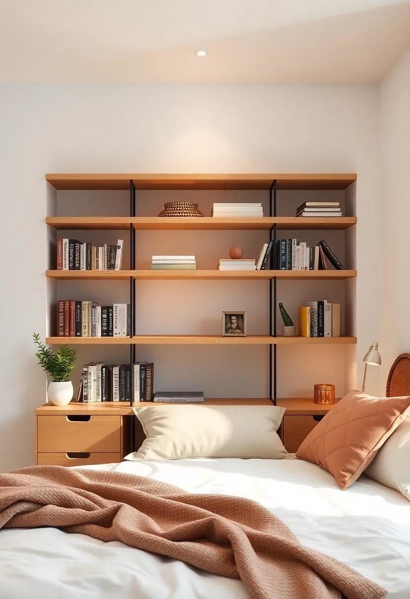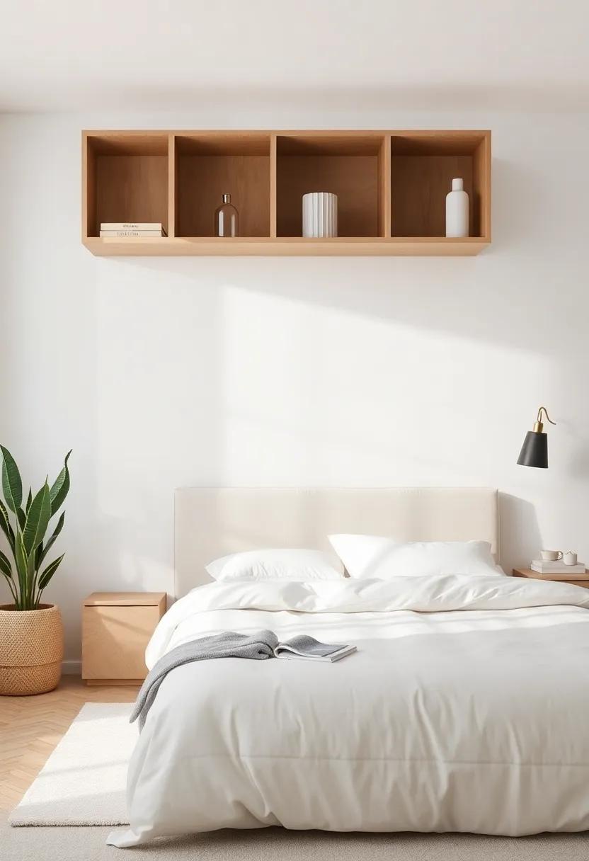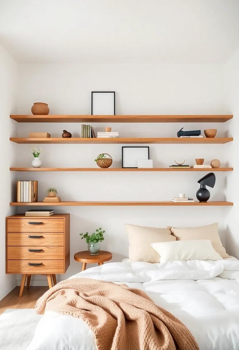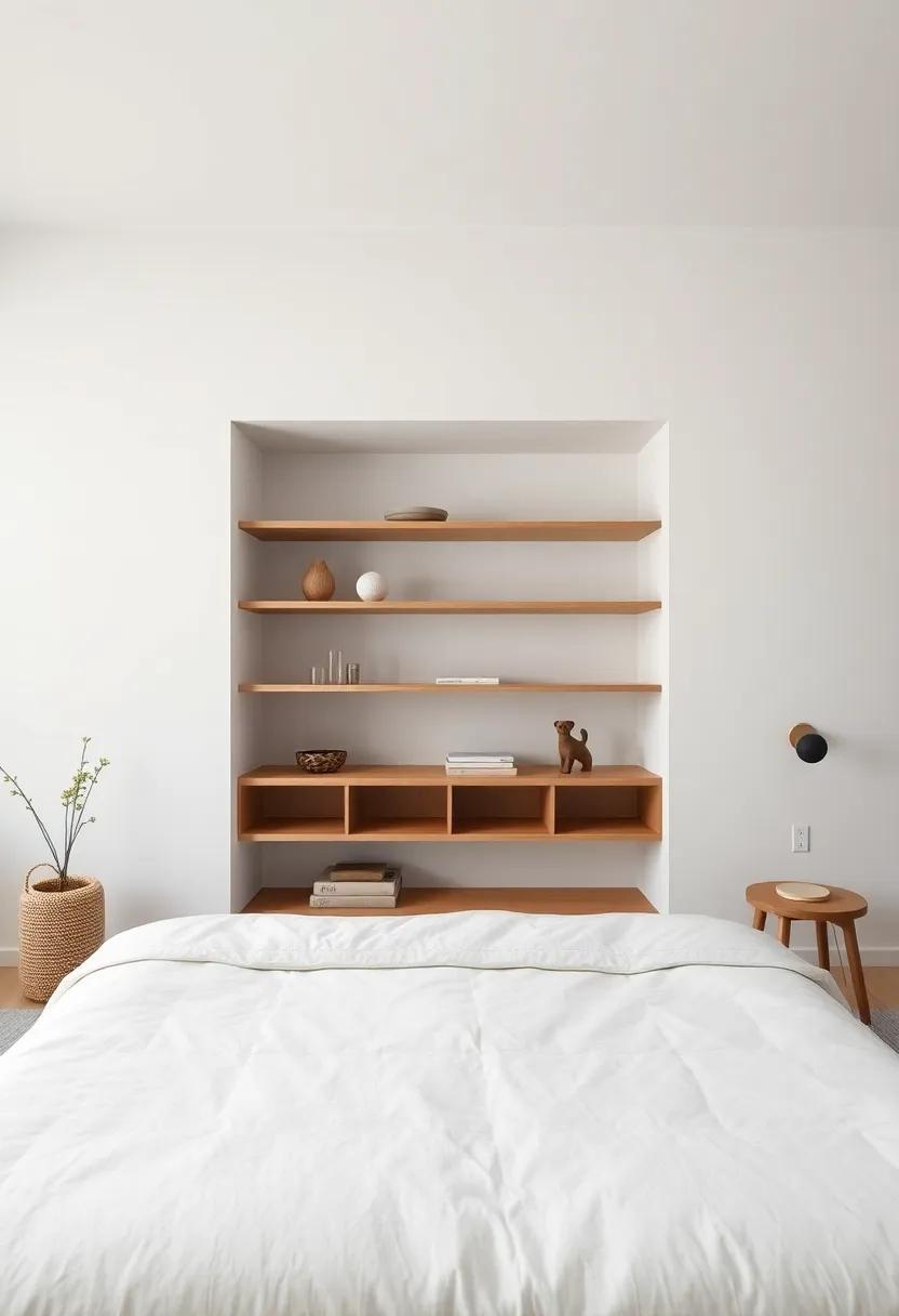 Embracing the ebb and flow of minimalism doesn’t mean sacrificing style; instead, it’s a festivity of functionality and elegance. Open shelving offers a perfect solution to maximize vertical space, ensuring your bedroom feels spacious while showcasing aesthetically pleasing elements. To create an inviting atmosphere, consider incorporating a mix of practical items and decorative pieces. Some ideas for your open shelves include: