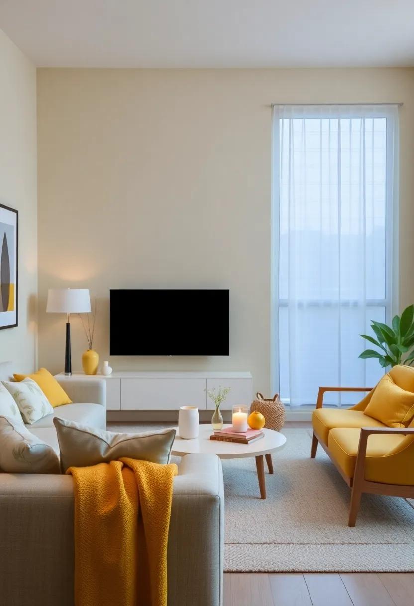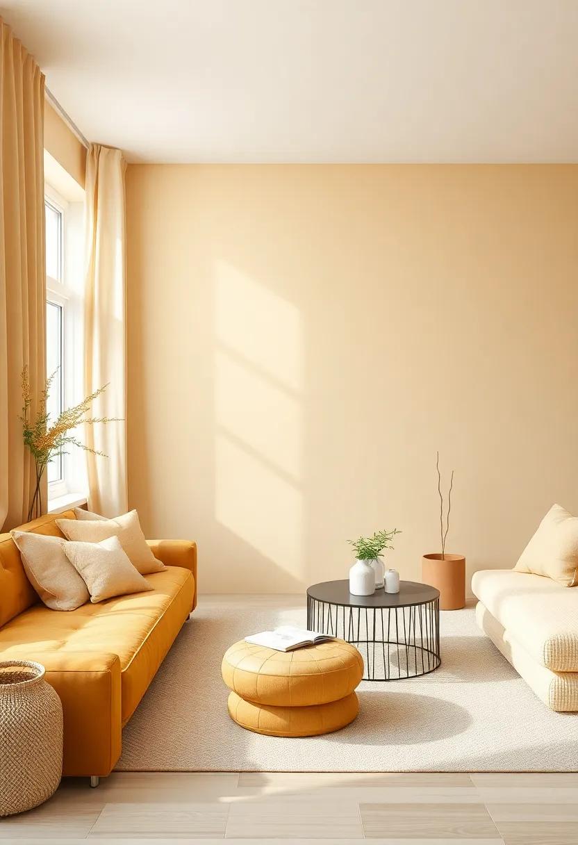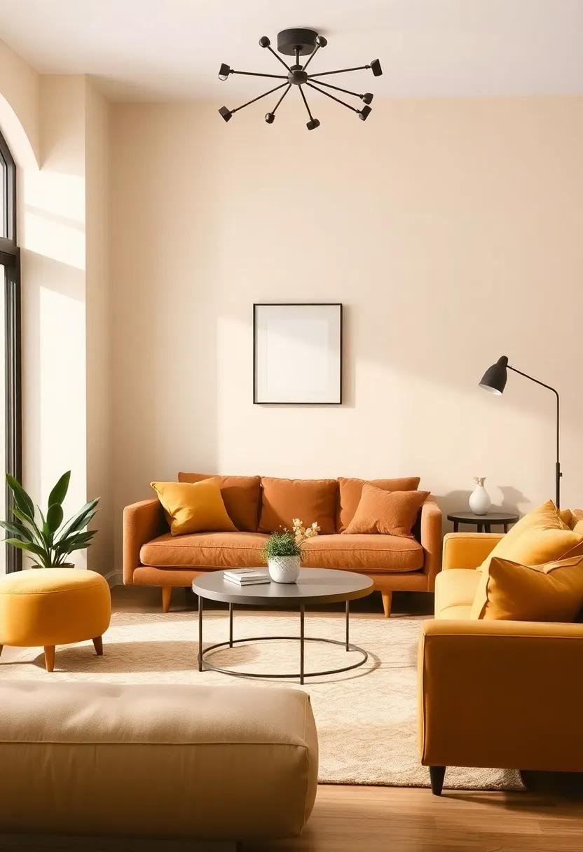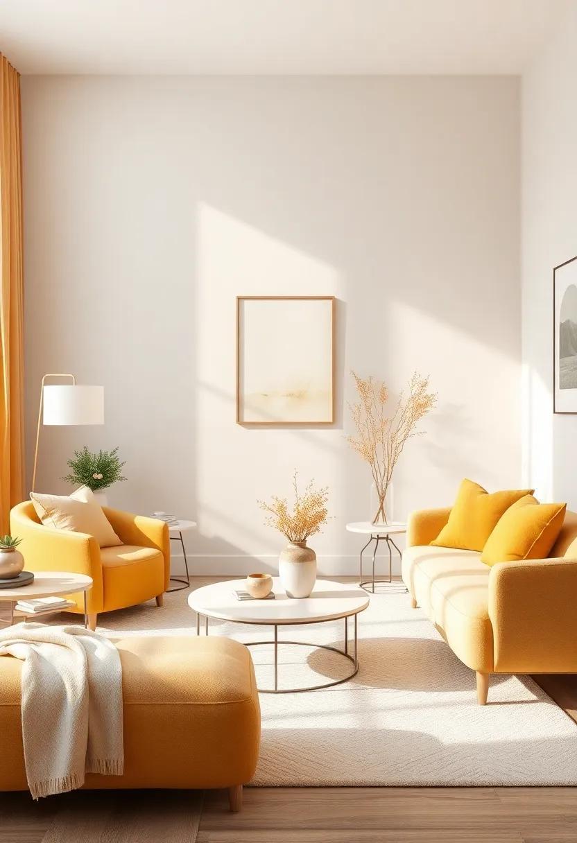 - Furniture: Choose accent chairs or ottomans in mustard, complemented by cream side tables.
