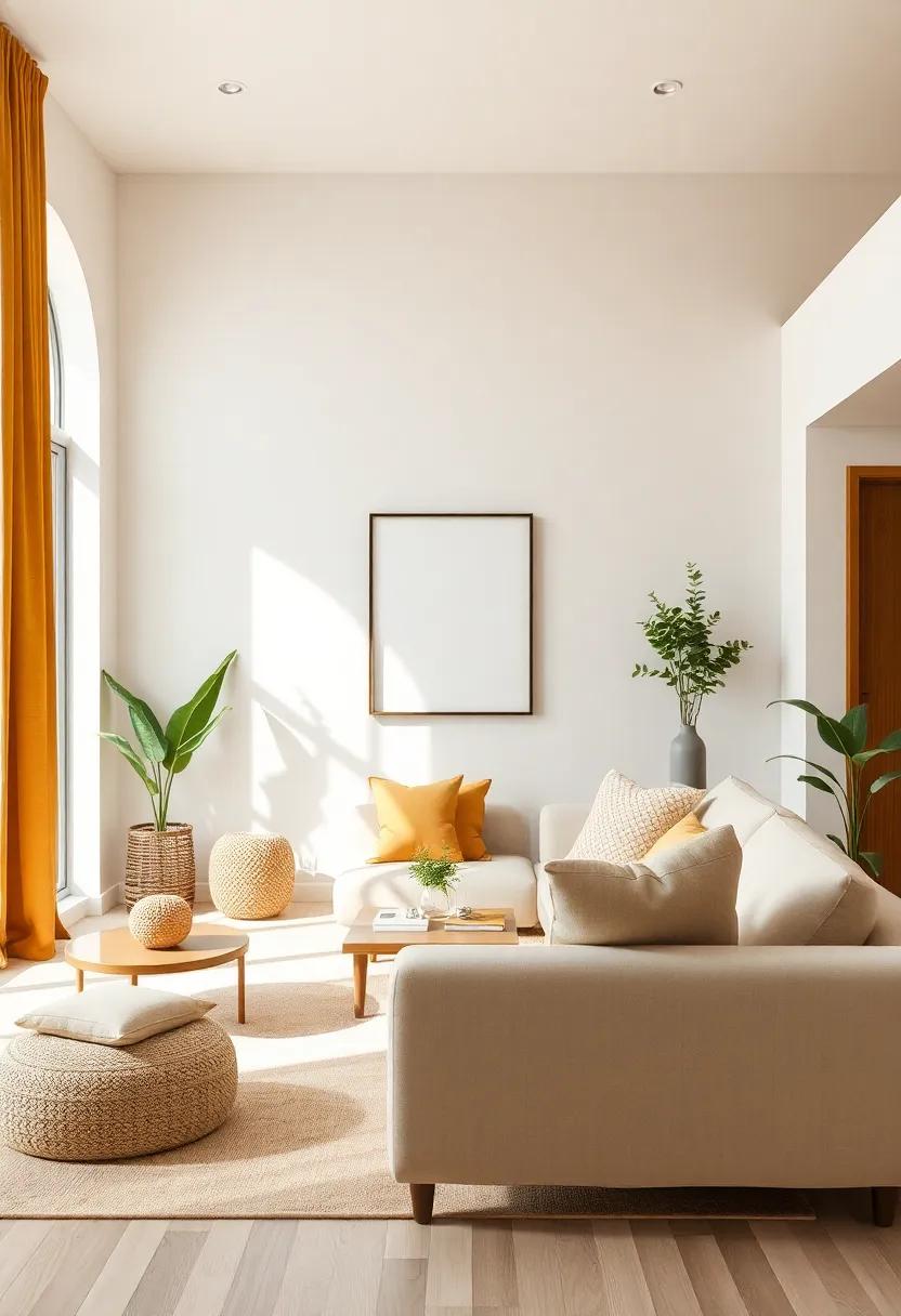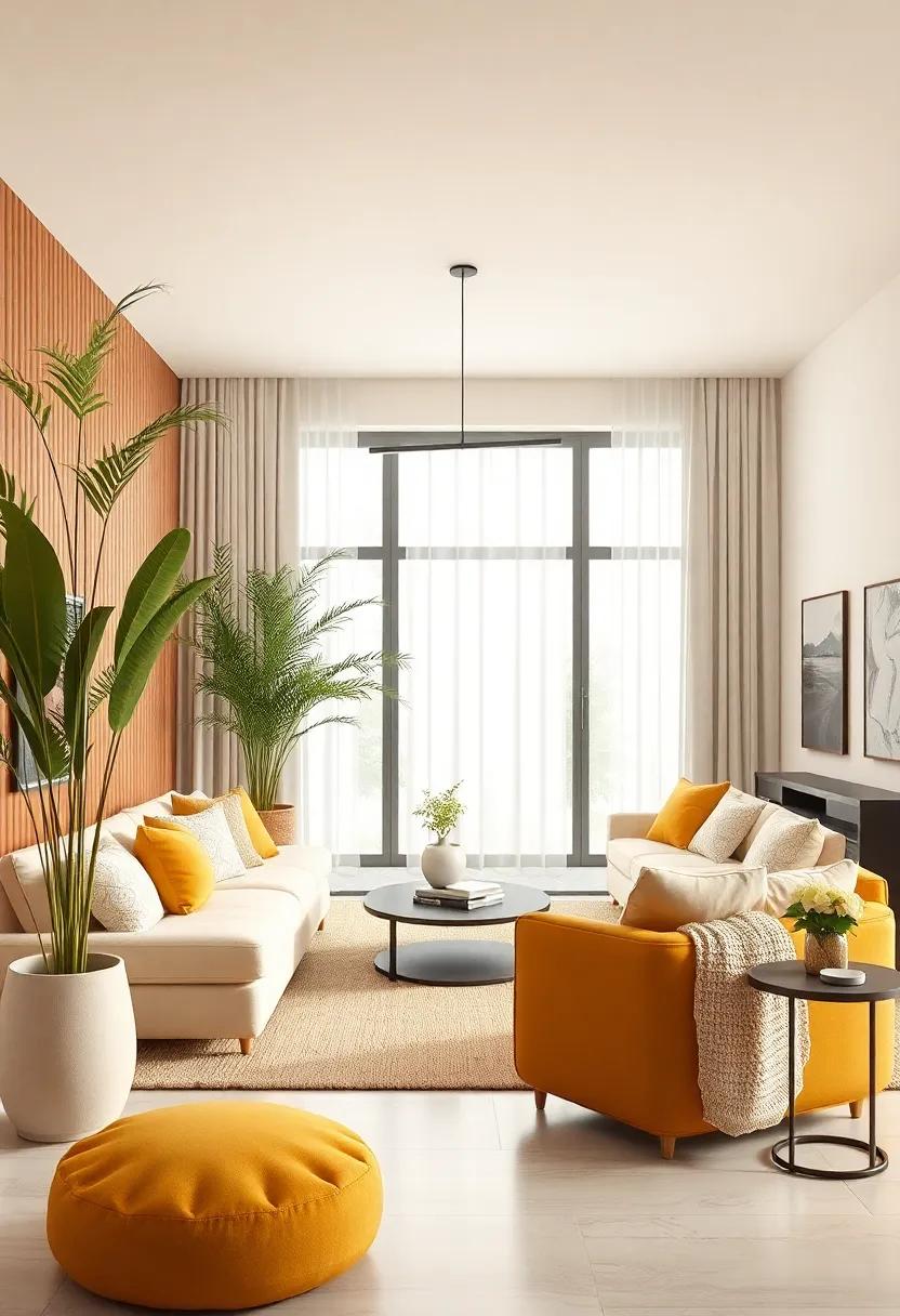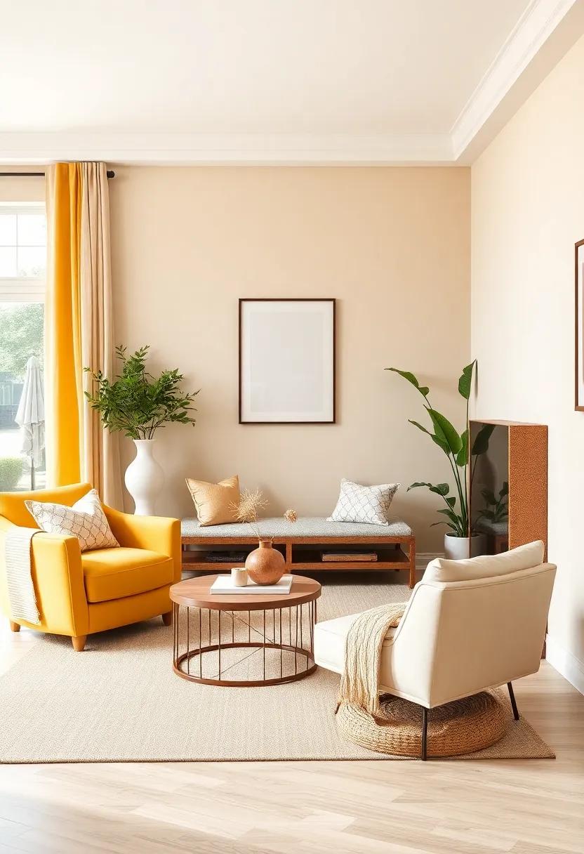 Adding greenery into the decor not only infuses life but also complements the muted palette beautifully. Plants like fiddle leaf figs or snake plants can stand out against cream walls while harmonizing with mustard accents found in vases or decorative pillows. Moreover, enhancing the space with natural lighting—through sheer curtains that diffuse sunlight—can make the room feel airy and well-connected to nature. For an elegant touch, consider a simple table arrangement of earthy decorative items, such as wooden bowls and textured ceramics, which will anchor the design while maintaining a breezy, elegant vibe.