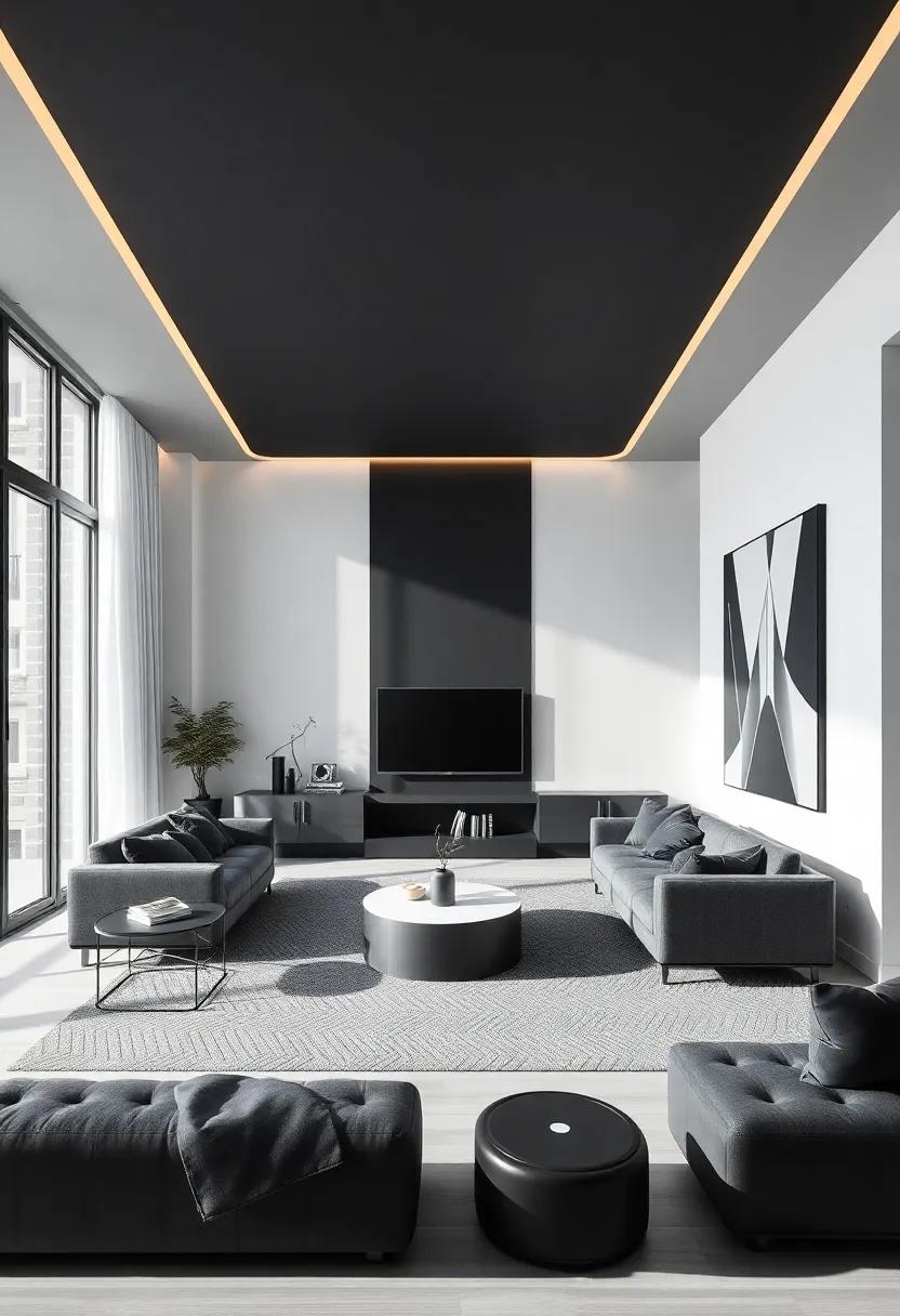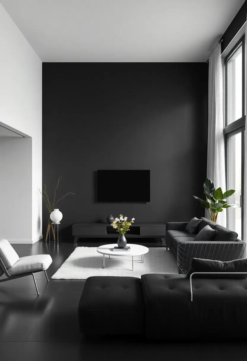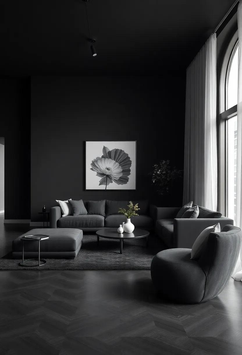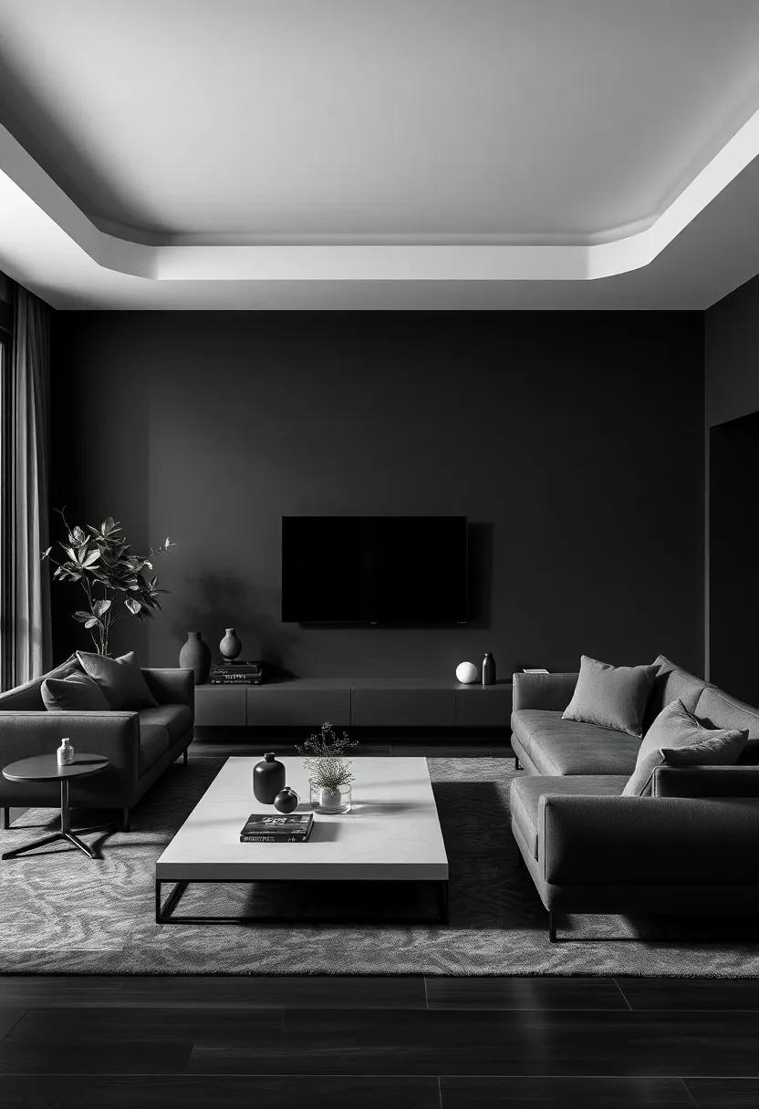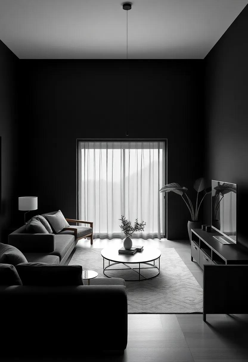 Lines and shapes serve as the foundational building blocks of design, especially in a minimalist black living room where simplicity reigns. The clean, straight lines of furniture evoke a sense of order, creating a space that feels both calming and sophisticated. In contrast, curved elements—whether through a round coffee table or soft-edged cushions—add a layer of comfort without overwhelming the aesthetic. The interplay between these lines is crucial; they guide the eye and shape the spatial experience. by choosing furnishings and decor with intentional shapes, you can enhance the overall ambiance, making a striking statement even in understated tones.