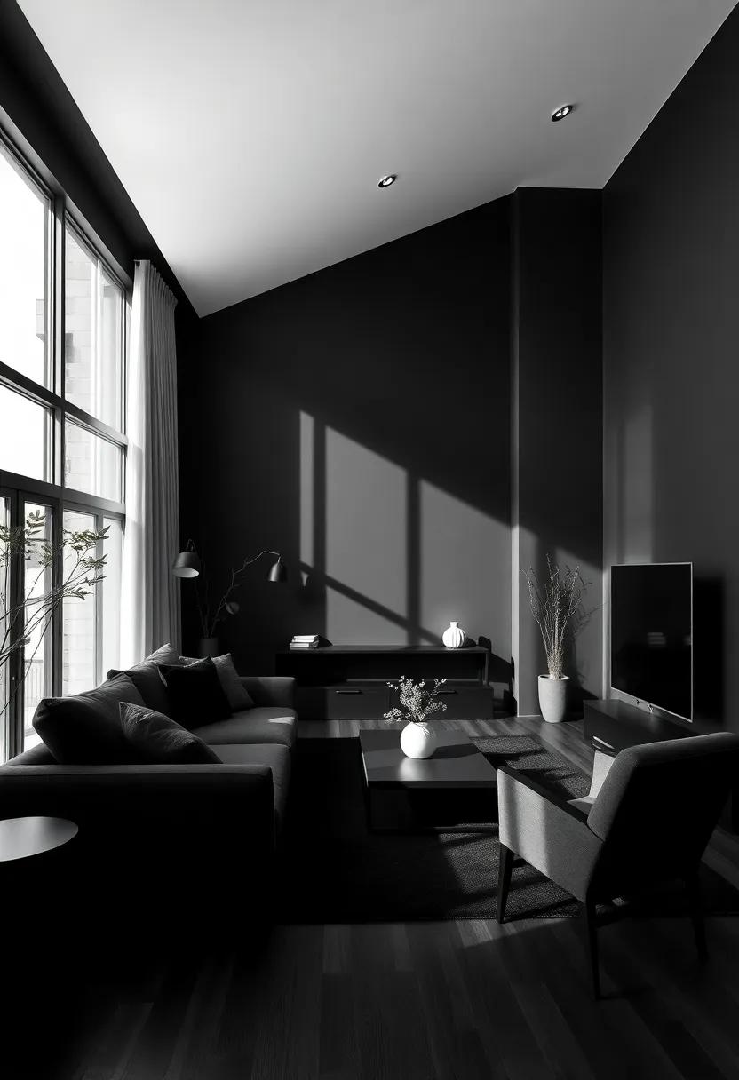 Natural light serves as a transformative element in any interior space, especially in a minimalist black living room. The interplay between light and shadow can elevate the richness of black surfaces, infusing warmth and depth that might otherwise be overshadowed by the room’s dark palette. when sunlight streams through windows, it casts gentle highlights and creates striking contrasts, allowing textures like matte finishes or glossy accents to come alive. Additionally, the use of mirrors strategically placed to reflect light can enhance this effect, making the space feel more expansive and inviting.