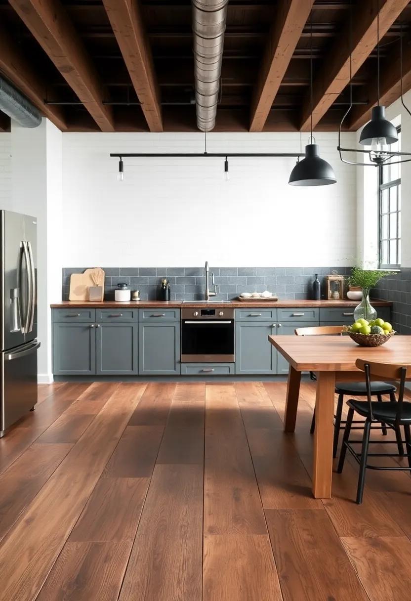 When creating an industrial rustic kitchen, the right flooring can set the tone and enhance the aesthetic you’re aiming for. Opt for materials that boast a blend of ruggedness and charm, such as reclaimed wood or textured concrete. These flooring options not only augment the industrial appeal with their raw and unrefined look but also provide a warm, inviting feel that is essential in a kitchen setting. Consider these impactful choices: