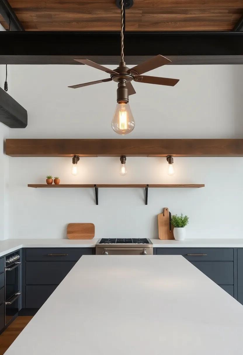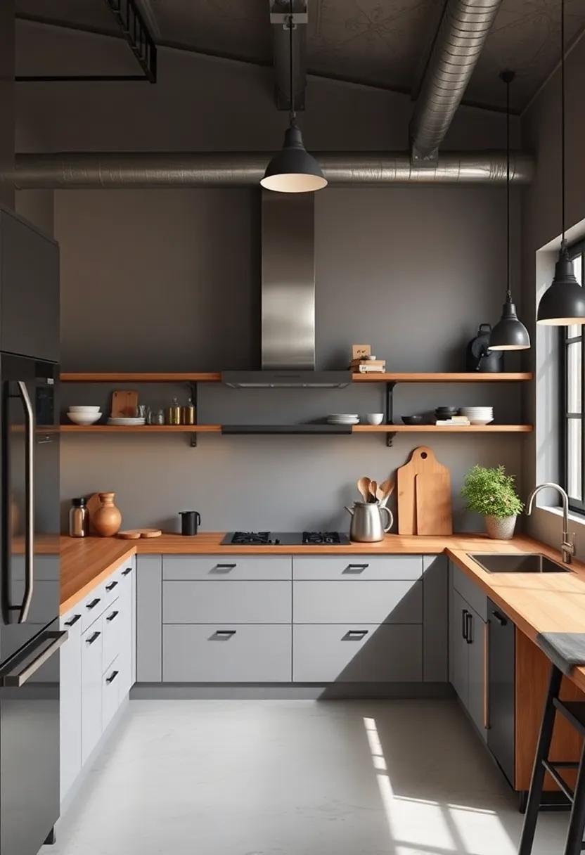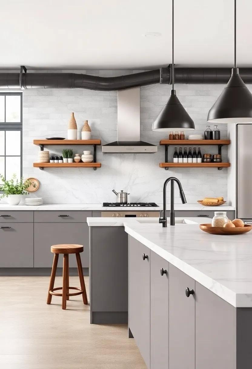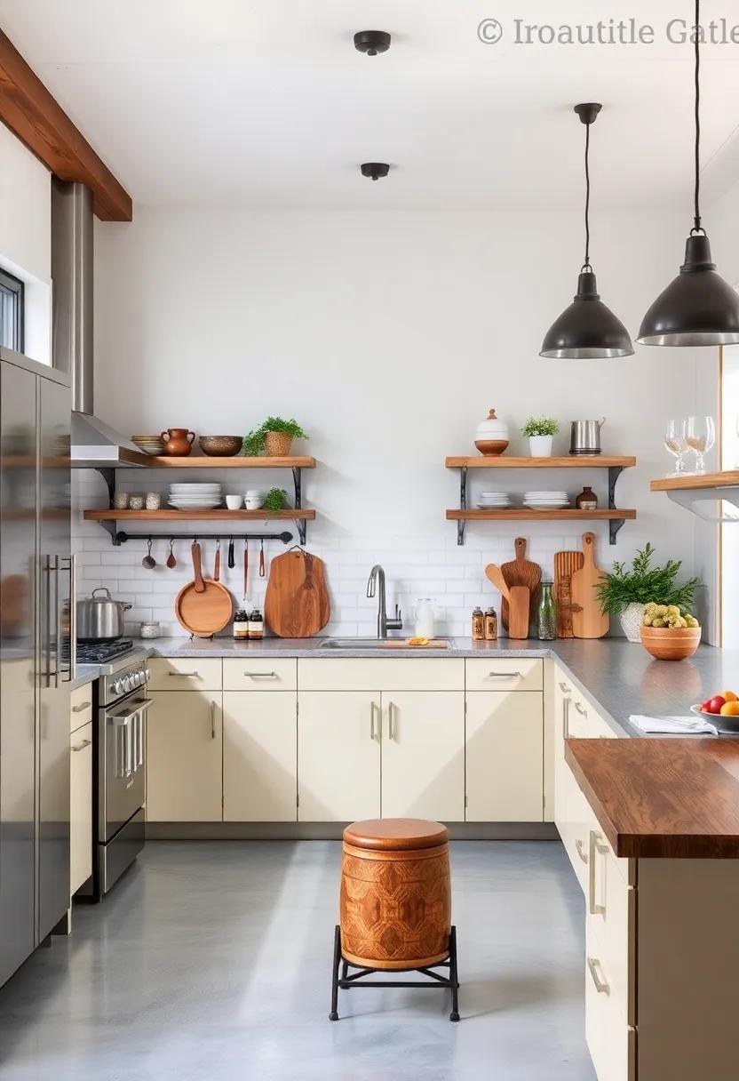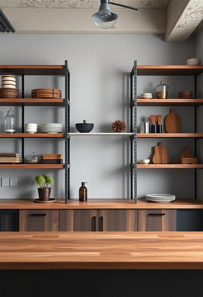 Open shelving is the perfect blend of form and function, providing a stunning way to showcase your kitchen essentials while making them easily accessible. By using natural wood shelves or metal brackets, you can emphasize the industrial rustic charm of your kitchen. Consider integrating a mix of open shelves and cabinets to create visual interest while maintaining organization. An eclectic mix of dishware, cookbooks, and personal touches like framed photos or potted herbs can transform the shelving into a showcase of your personality and lifestyle.