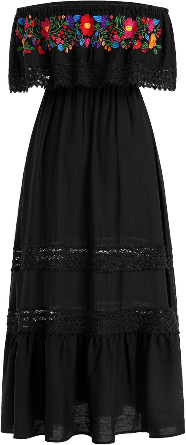 This dress stands out for its vibrant embroidery and comfortable off-shoulder design, making it a perfect choice for festive occasions and casual summer outings alike. Its relaxed, loose fit paired with a floor-length style offers both elegance and breathability, ideal for those warm Cinco de Mayo celebrations or any event where you want to embrace traditional flair with a modern twist. We appreciate how the lace detailing complements the colorful floral prints, adding texture without overwhelming the overall look.