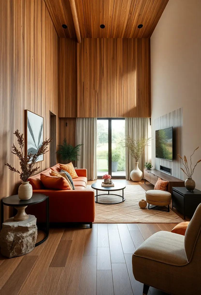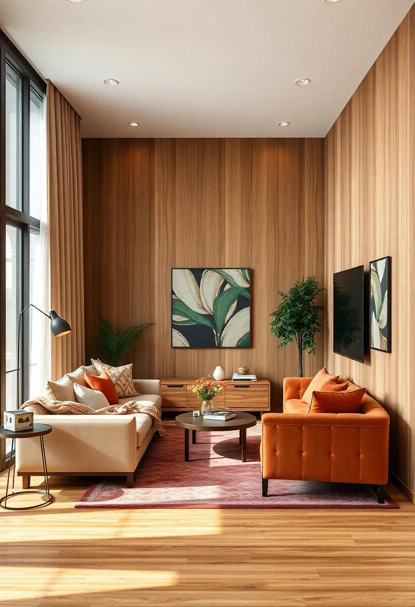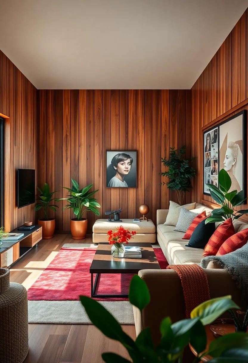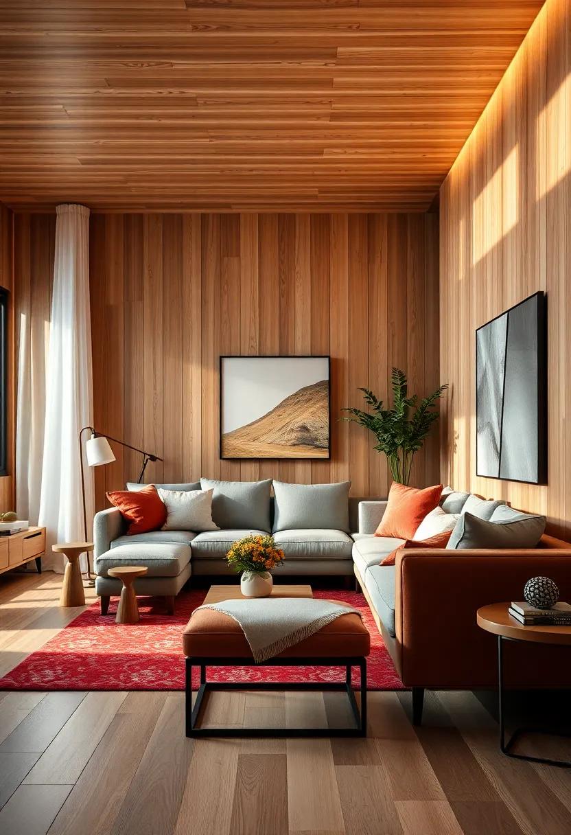 In addition to these tones, complementing your wood paneling with textures can enhance the overall design. Such as, consider incorporating plush textiles like a soft rust-colored throw or golden-hued cushions to add warmth and comfort. A curated selection of decor pieces can also elevate your living space: