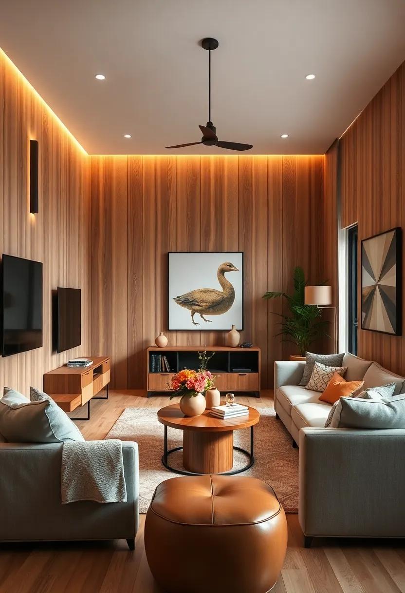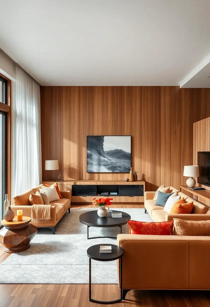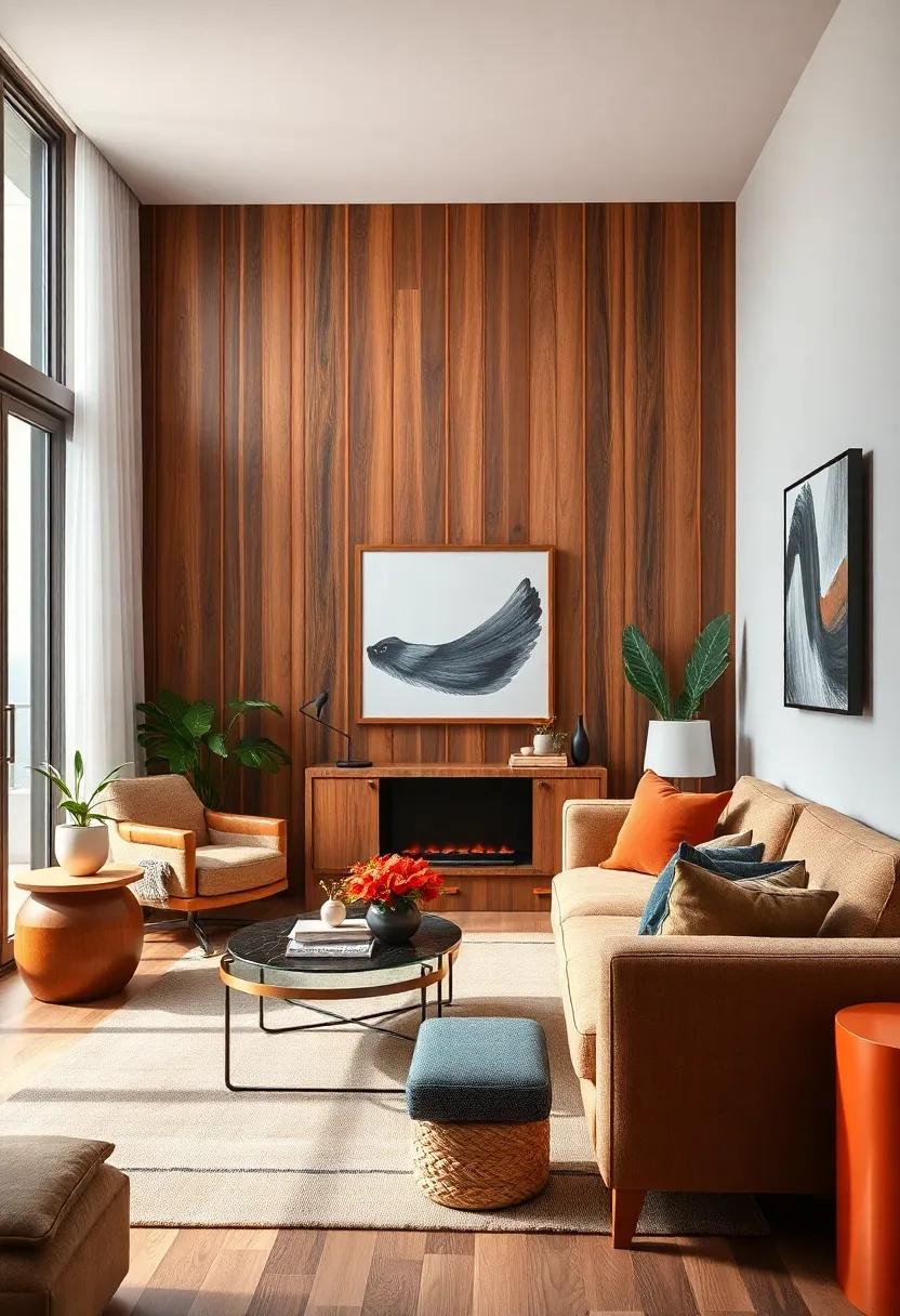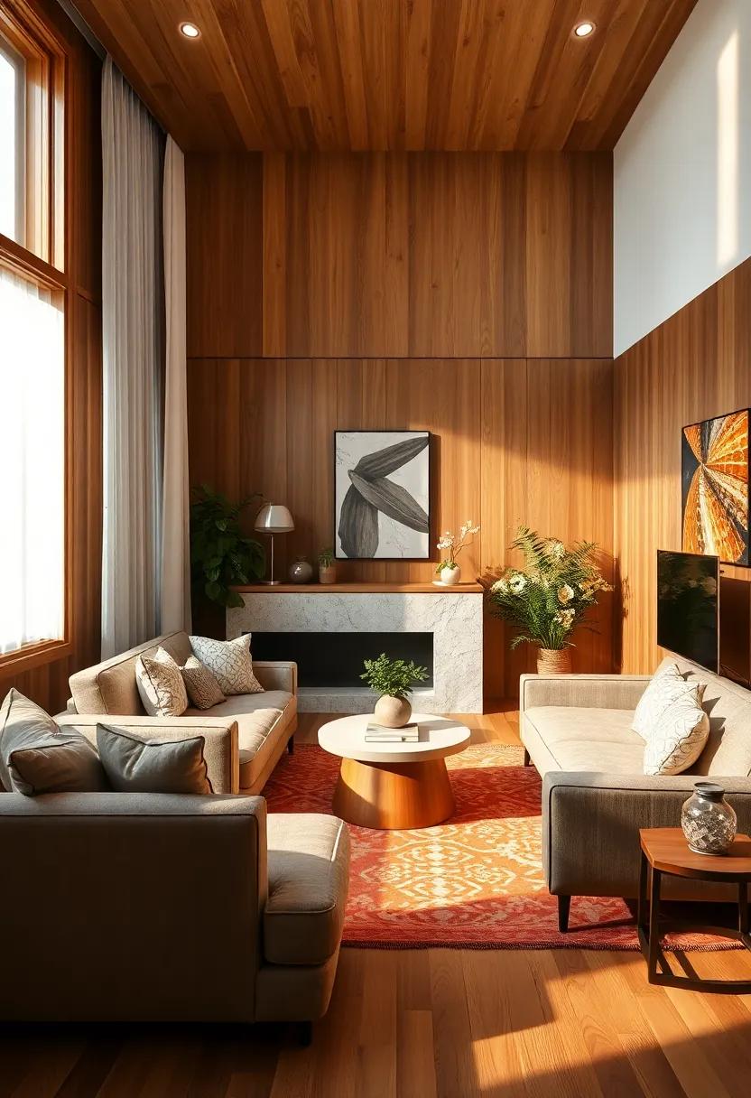 In addition to these tones, complementing your wood paneling with textures can enhance the overall design. Such as, consider incorporating plush textiles like a soft rust-colored throw or golden-hued cushions to add warmth and comfort. A curated selection of decor pieces can also elevate your living space: