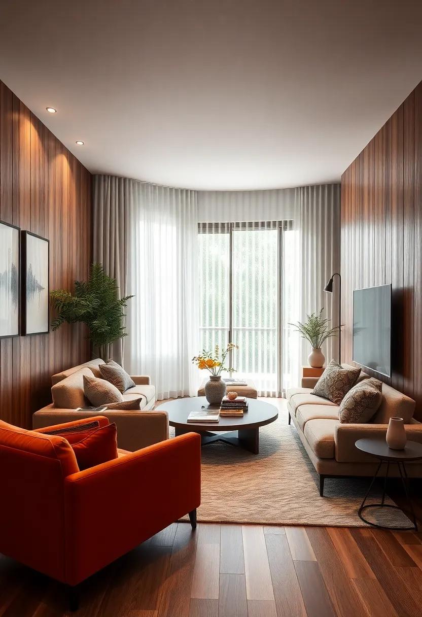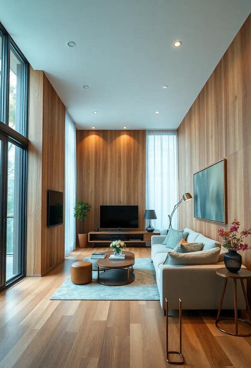 Incorporating wood finishes in small living rooms enhances the interplay between light and shadow, creating a cozy ambiance that invites relaxation. The choice of wood can substantially affect the overall feel, with -light woods like ash or maple reflecting sunlight and making the space feel larger, while dark woods such as walnut or mahogany add a sense of elegance and warmth.Cleverly placed paneling can draw the eye upwards, enhancing ceiling height perception, while textured finishes invite tactile engagement, particularly when paired with softly diffused lighting. This balance creates an enchanting visual depth that breathes life into the smallest of spaces.