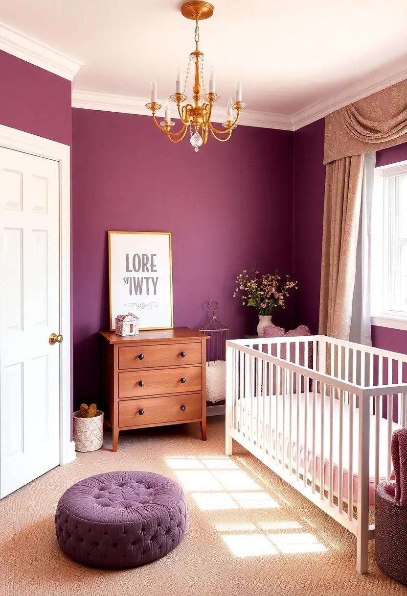 To further enrich the nursery’s visual appeal, integrating varying textures in these shades can elevate the design. Delicate fabrics like velvets and plush textiles in plum can be used for curtains or bedding, while a sleek gold lamp can serve as a stunning focal point. Incorporate decorative accents such as cushions and wall art in complementary colors to create a cohesive look. Below is a simple color guide to help you visualize the enchanting palette: