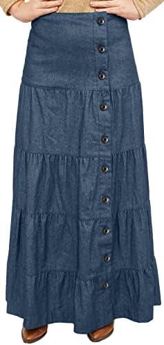 This ankle-length tiered denim skirt features a versatile design that allows for multiple styling options. With its side front button opening, the garment exudes a trendy prairie look, perfect for pairing with both boots and casual flats. The drop waist yoke is designed to sit comfortably on the high hip, making it easy to wear throughout the day. With a length of 37 inches, it offers both coverage and style, suitable for various occasions from casual outings to more dressy events.
